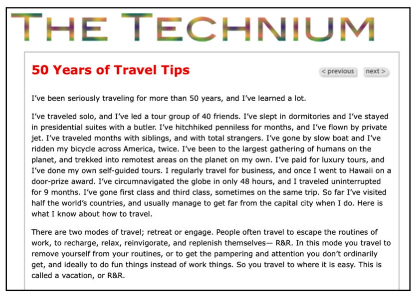 READ ✈️: The wise and peripatetic Kevin Kelly has distilled 50 years of travel wisdom into a single list. (One gem: If you hire a driver, pay them to take you to visit their mother!) A brilliant compilation. Don’t leave home without it.